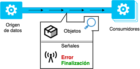 💡 Recordemos que, dada la definición de la programación reactiva, las comunicaciones entre source y consumer son asíncronas: el consumer nunca sabe a ciencia cierta cuándo va a recibir la información del source al cual suscribe.
