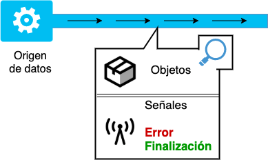 Los orígenes de datos pueden enviar adicionalmente a los objetos habituales, dos tipos de señales específicas que «cortan» el flujo de información enviado: de error si se produjo un problema en su funcionamiento, o de finalización en caso de que haya completado la emisión de datos y no tenga nada más que enviar.